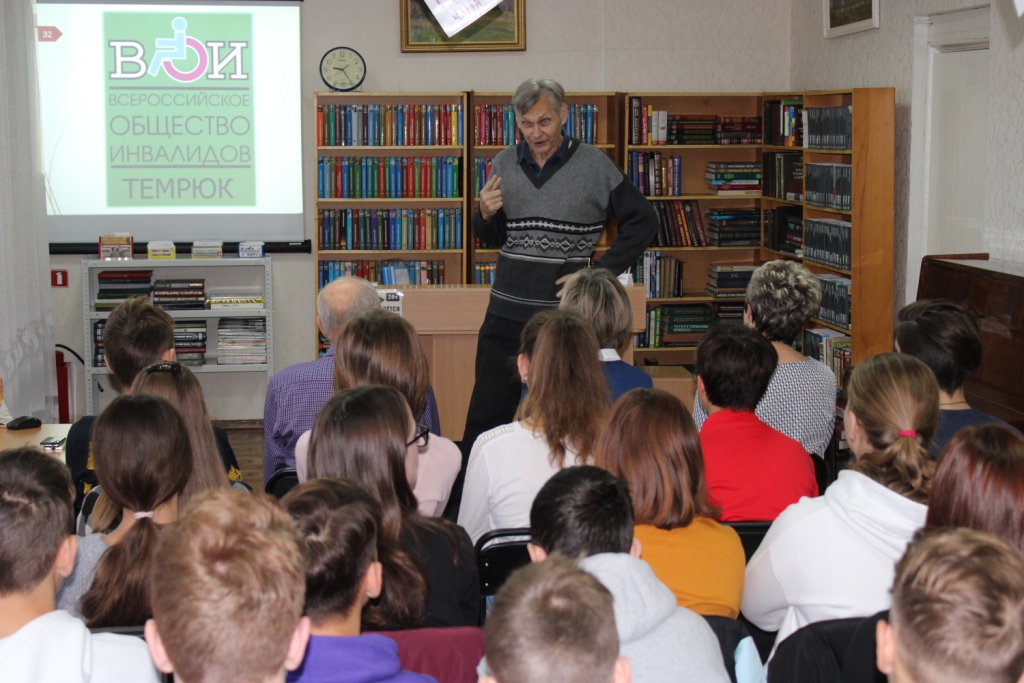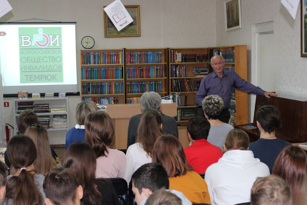 Такие люди, обладающие невероятной волей к жизни, верой в себя и свои возможности, есть и среди нас. В Темрюкском районе уже много лет существует районная организация Всероссийского общества инвалидов, деятельность которой направлена на поддержку, защиту и адаптацию людей с ограничениями по здоровью. О насыщенной культурной, познавательной, спортивной жизни членов общества рассказали школьникам исполняющий обязанности председателя правления Темрюкского районного общества инвалидов Юрий Самохвалов и член правления, а также постоянный читатель библиотеки, Станислав Бурдеев.