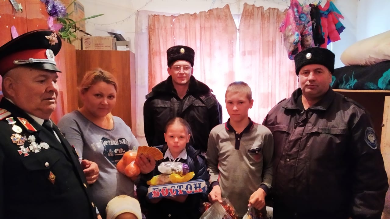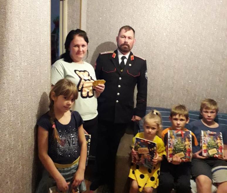 Также трем многодетным одиноким матерям из пос. Стрелка, г. Темрюка и пос. Приморского атаманами хуторских казачьих обществ Темрюкского района оказана помощь в виде продуктовых наборов, сладких подарков и сертификатов на приобретение детской обуви в магазине детских товаров.