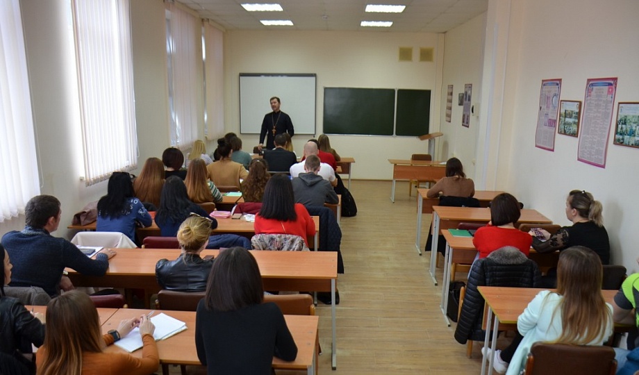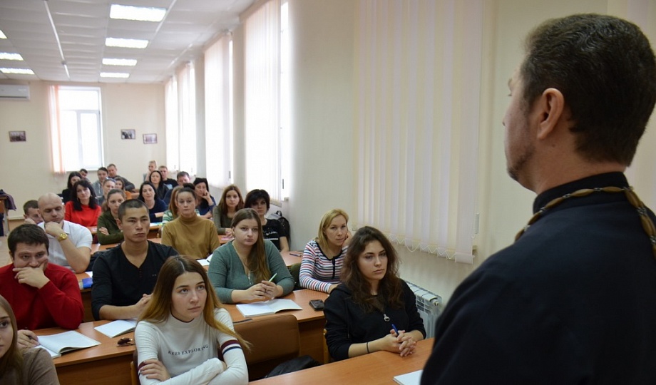 16 декабря 2019 года у студентов 2 курса заочной формы Кубанского казачьего государственного института пищевой индустрии и бизнеса, обучающихся по специальности «Государственное и муниципальное управление» (ЗФО), состоялась заключительная лекция с последующим зачетом по предмету «Духовно-нравственные основы и культура казачества». Занятие с группой в количестве 50 человек, в рамках соглашения о сотрудничестве, провел настоятель храма святого благоверного князя Александра Невского, духовник данного учебного заведения протоиерей Виталий Колмык. Священнослужитель напомнил присутствующим о первых казаках на Кубани, их традициях и значимости православной веры в жизни казака, воинских заслугах; так же рассказал о рождественском посте, объяснил различия Григорианского и Юлианского календарей, а, соответственно, появление старых и новых стилей; затем ответил на все интересующие вопросы, касающиеся веры и духовной жизни. Затем все присутствующие студенты положительно ответили на вопросы по предмету.