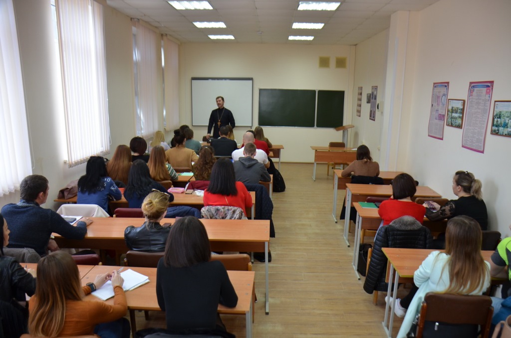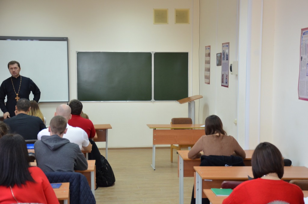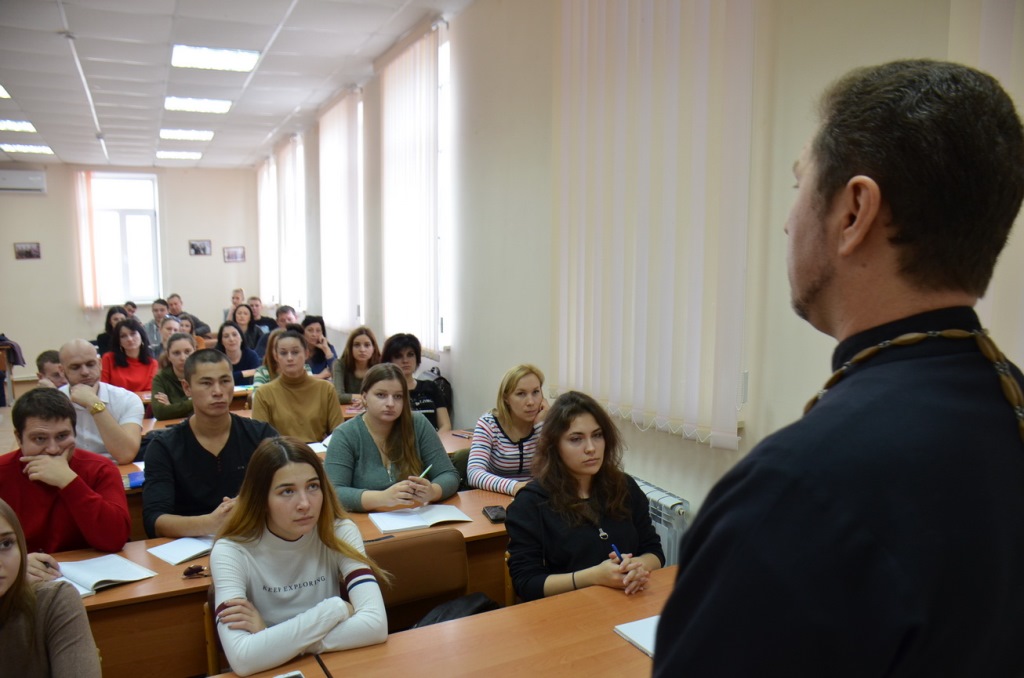16 декабря 2019 года у студентов 2 курса заочной формы Кубанского казачьего государственного института пищевой индустрии и бизнеса, обучающихся по специальности «Государственное и муниципальное управление» (ЗФО), состоялась заключительная лекция с последующим зачетом по предмету «Духовно-нравственные основы и культура казачества». Занятие с группой в количестве 50 человек, в рамках соглашения о сотрудничестве, провел настоятель храма святого благоверного князя Александра Невского, духовник данного учебного заведения протоиерей Виталий Колмык. Священнослужитель напомнил присутствующим о первых казаках на Кубани, их традициях и значимости православной веры в жизни казака, воинских заслугах; так же рассказал о рождественском посте, объяснил различия Григорианского и Юлианского календарей, а, соответственно, появление старых и новых стилей; затем ответил на все интересующие вопросы, касающиеся веры и духовной жизни. Затем все присутствующие студенты положительно ответили на вопросы по предмету.