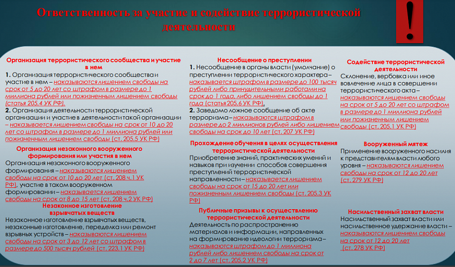 Статья 205. Террористический акт. Предусмотрено лишение свободы на срок от десяти до двадцати лет, в некоторых случаях пожизненным лишением свободы.