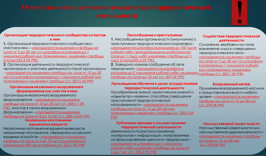 Статья 205. Террористический акт. Предусмотрено лишение свободы на срок от десяти до двадцати лет, в некоторых случаях пожизненным лишением свободы.