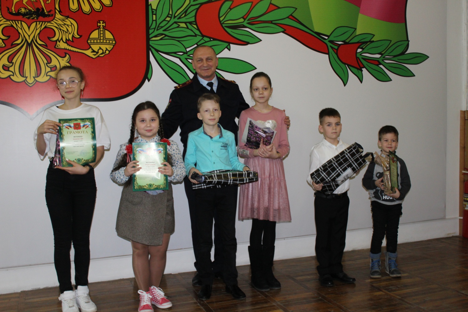 Начальник Отдела полковник полиции Александр Лишута вручил детям почетные грамоты и памятные подарки: Софье Евтушенко, Михаилу Коляде, Богдану Кобзарь, Марии Тупович, Данилу Малявко, Екатерине Тихой, Ангелине Павловой, Софии Иваненко, сообщает пресс-служба Отдела МВД России по Темрюкскому району.