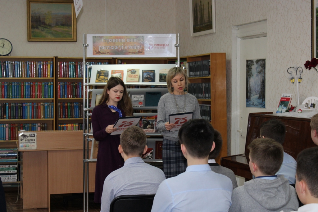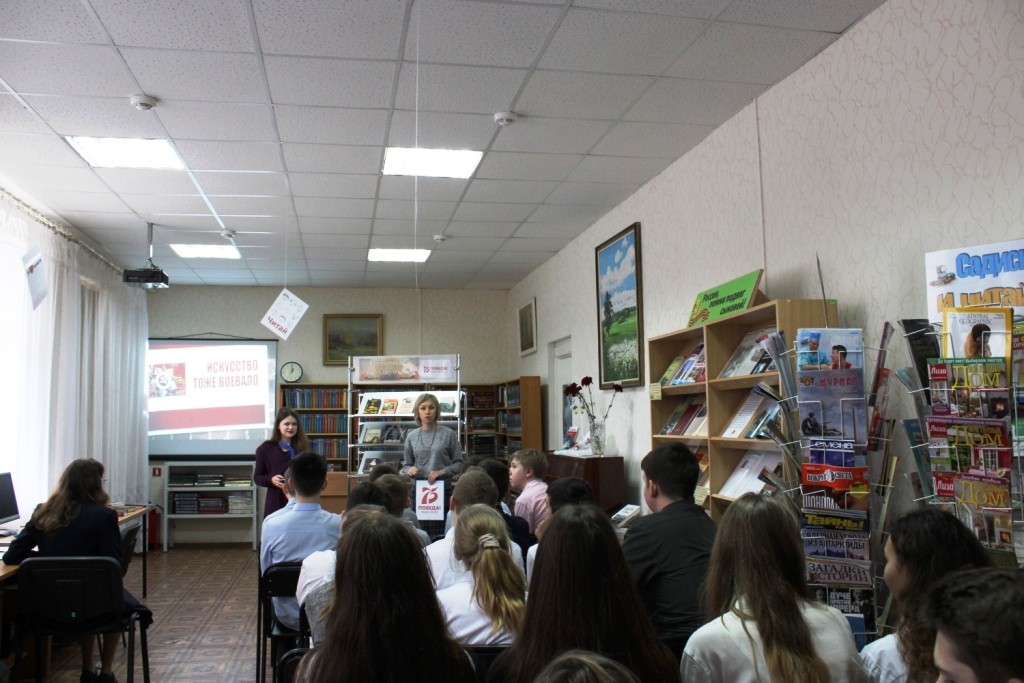 Десятилетия отделяют нас от событий Великой Отечественной войны. Но время не снижает интереса к этой теме, обращая внимание прежде всего современного поколения к далеким фронтовым годам, к истокам подвига и мужества нашего народа. Продолжая целенаправленную работу по гражданско-патриотическому воспитанию молодежи, 21 февраля специалисты межпоселенческой библиотеки для учащихся 7 «В» класса школы №1 провели мероприятие «Искусство тоже воевало».