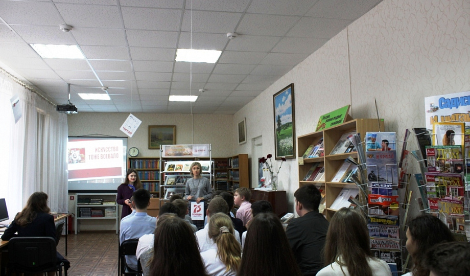 Десятилетия отделяют нас от событий Великой Отечественной войны. Но время не снижает интереса к этой теме, обращая внимание прежде всего современного поколения к далеким фронтовым годам, к истокам подвига и мужества нашего народа. Продолжая целенаправленную работу по гражданско-патриотическому воспитанию молодежи, 21 февраля специалисты межпоселенческой библиотеки для учащихся 7 «В» класса школы №1 провели мероприятие «Искусство тоже воевало».