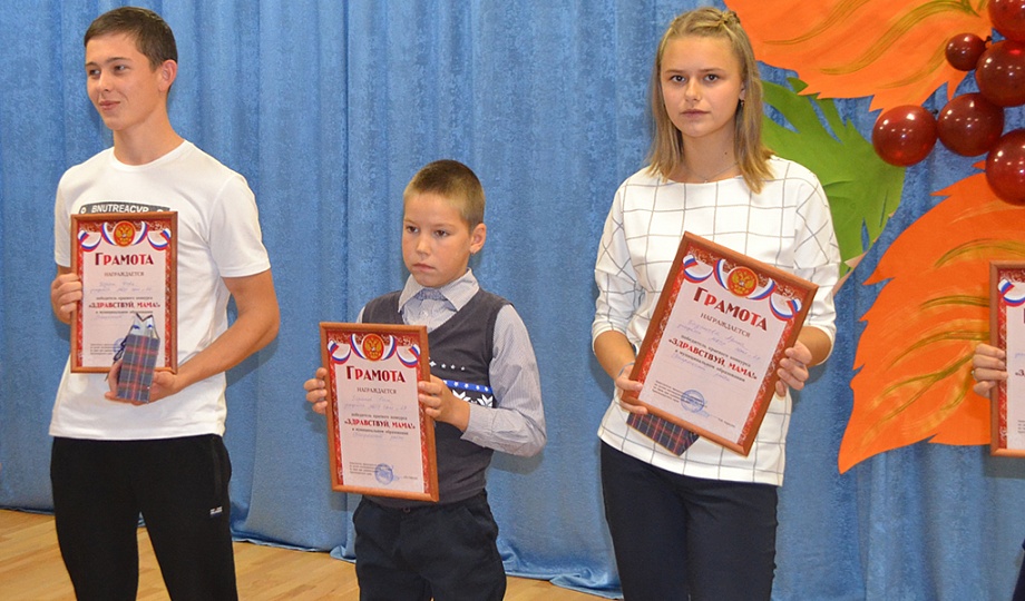 Церемония награждения победителей прошла в центре детского творчества во время праздничного концерта, посвященного Дню матери. Победители краевого конкурса «Здравствуй, мама!» получили грамоты комиссии по делам несовершеннолетних и защите их прав при администрации Краснодарского края и ценные подарки, все участники награждены дипломами, сообщает начальник отдела по делам несовершеннолетних О.В. Ткач.