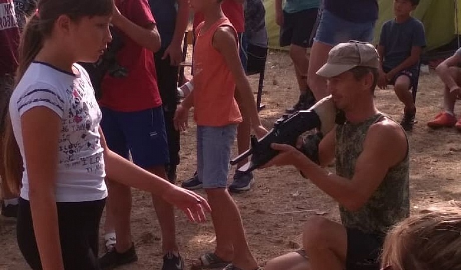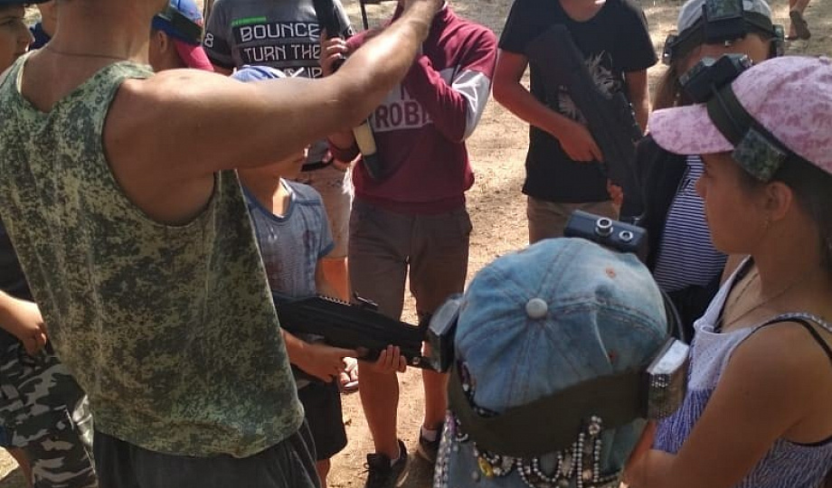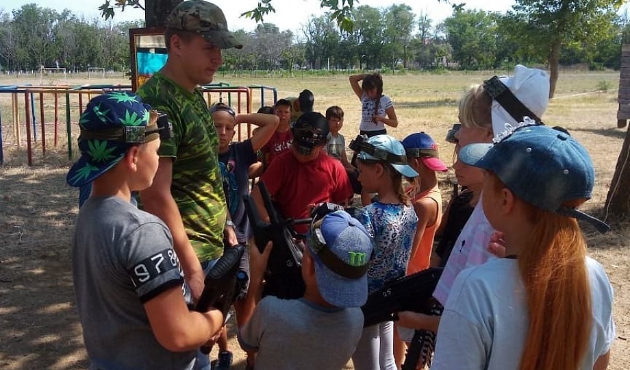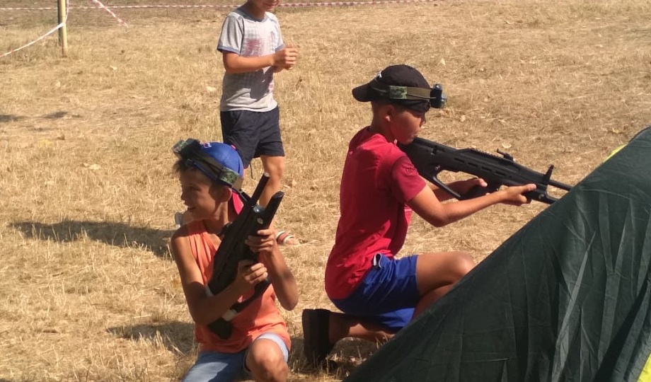 В поселке Ильич казаки станицы Голубицкой провели тренировку по военной подготовке с использованием тренировочного комплекта "Лазертаг" для казачат в детском казачьем лагере "Кадет".