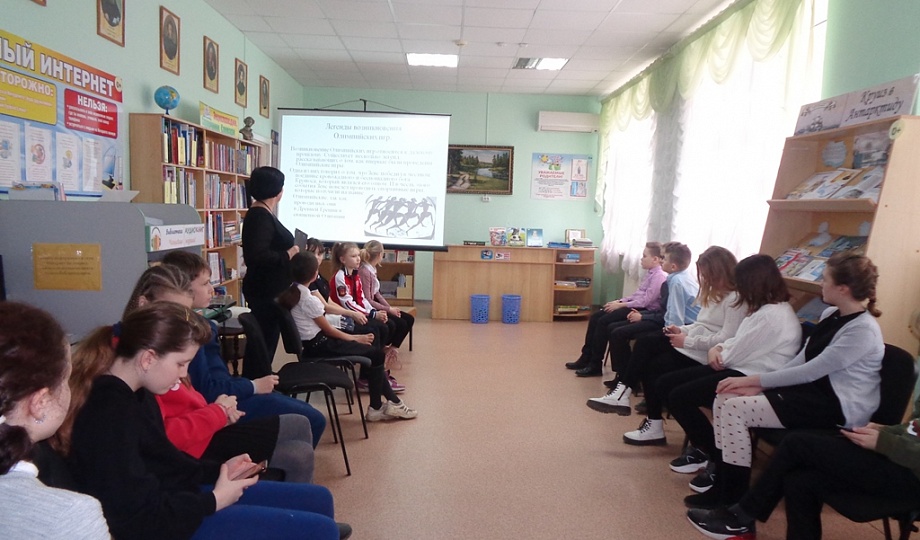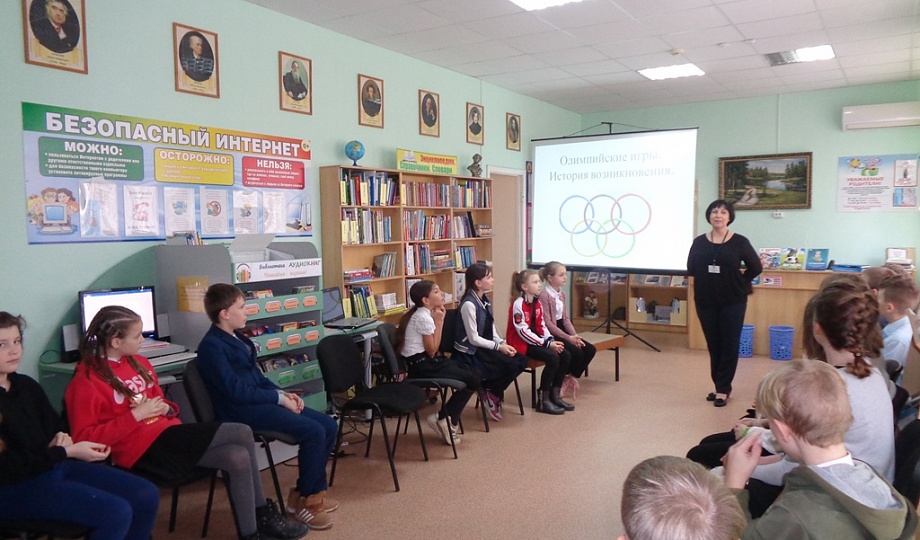 В этот день ребята путешествовали по стране спорта и здоровья. В начале урока проведена беседа об истории Олимпийских игр, была показана презентация. Затем школьники состязались в спортивно-развлекательной программе. С детьми провели физкульт-минутку, малые спортивные соревнования, они отвечали на вопросы по здоровому образу жизни и спорту, вспоминали и составляли пословицы о спорте и здоровье, разгадали кроссворд. Библиотекарь объяснил ребятам, что здоровый образ жизни помогает в достижении поставленных целей.