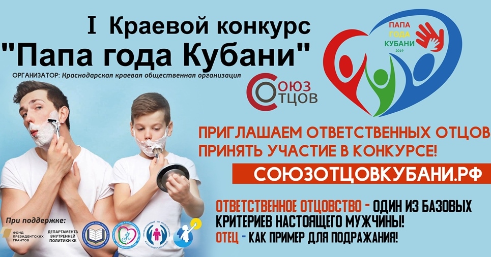 В целях признания и популяризации заслуг в области ответственного отцовства и социальной деятельности отцов, выявления лучших кубанских отцовских социальных практик, проектов и инициатив, направленных на воспитание детей в семье, Краснодарской краевой общественной организацией «Союз отцов» проводится региональный конкурс «Папа года Кубани».