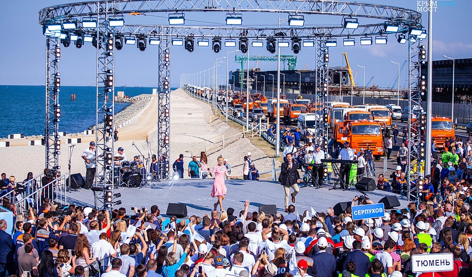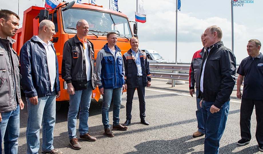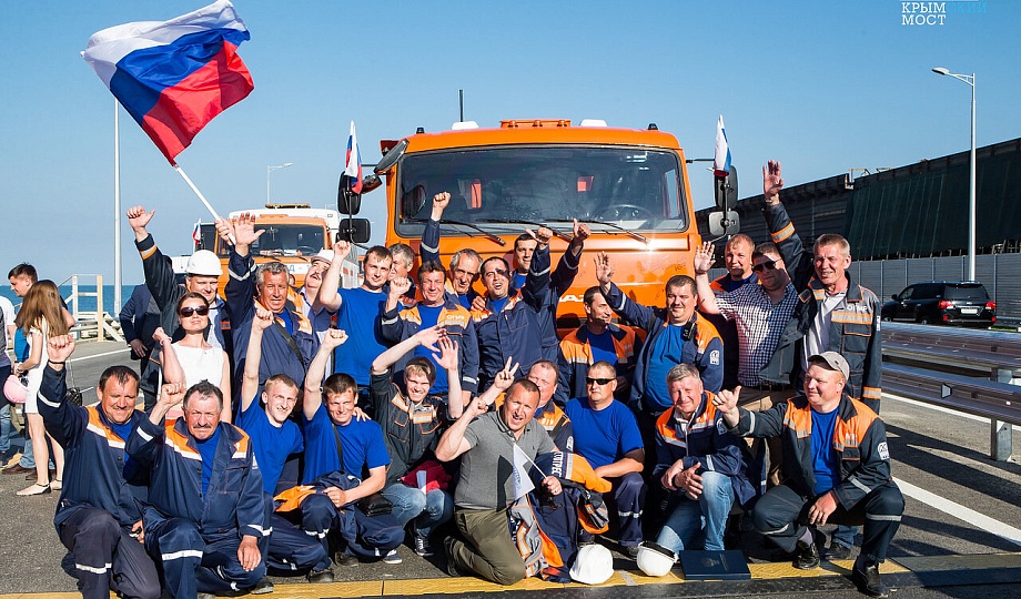 «На строительстве Крымского моста в пиковые месяцы трудилось более 14 тысяч инженеров и рабочих одновременно. Они работали круглосуточно в сложных погодных условиях. Перед командой мостовиков стояла непростая задача – построить мост в рекордно сжатые сроки и при этом максимально прочный и надежный. 19 километров автодорожной части возвели меньше чем за два с половиной года и сдали на 7 месяцев раньше указанного в графике срока», – рассказал заместитель генерального директора компании «СТРОЙГАЗМОНТАЖ» Леонид  Рыженькин.