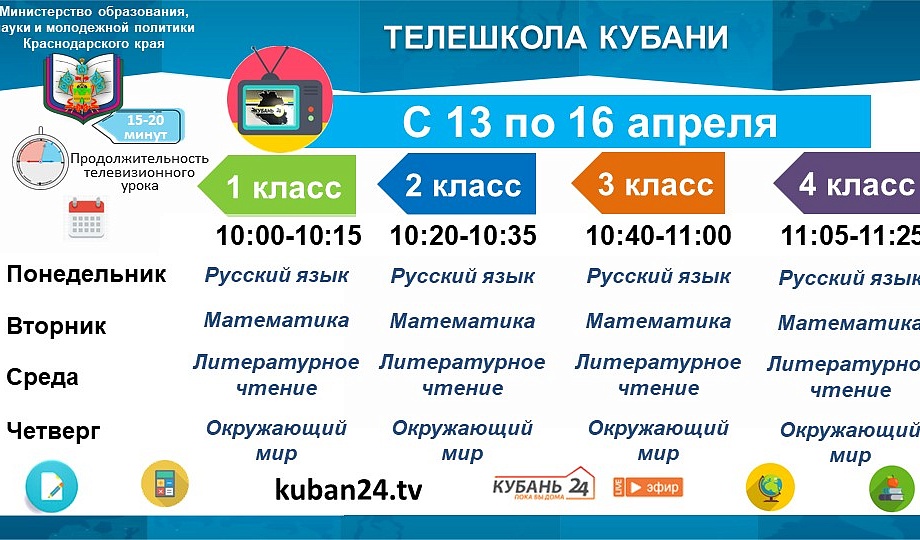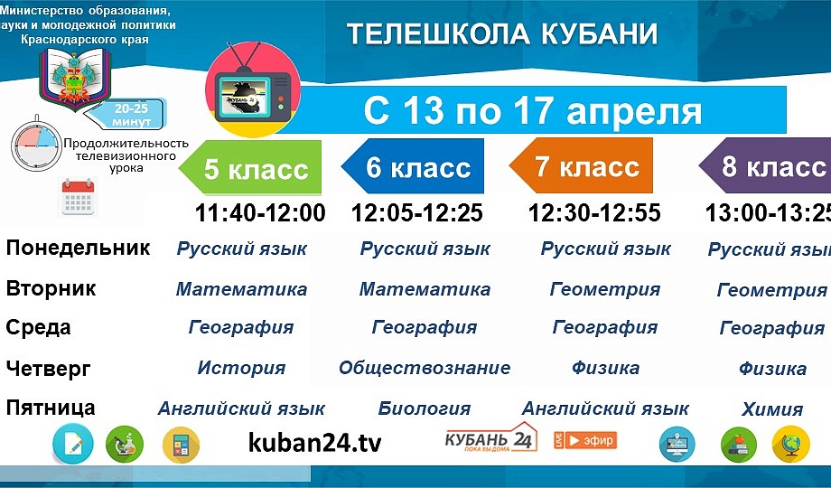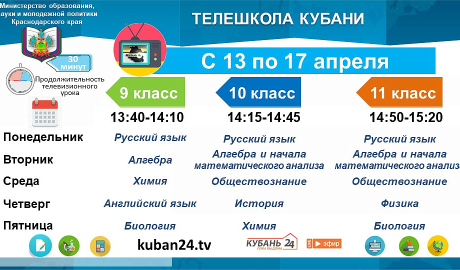В рамках проекта «Телешкола Кубани», реализуемого при поддержке губернатора края, в эфире канала «Кубань 24» ежедневно проходят консультации для учеников 9-11 классов. На следующей неделе расписание включает уроки для всех школьников, начиная с первого класса.
