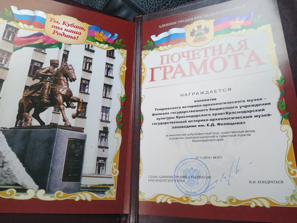 Почетными грамотами были награждены коллективы края, в том числе сотрудники Темрюкского музея в лице заведующего филиалом Владимира Владимировича Фефелова.