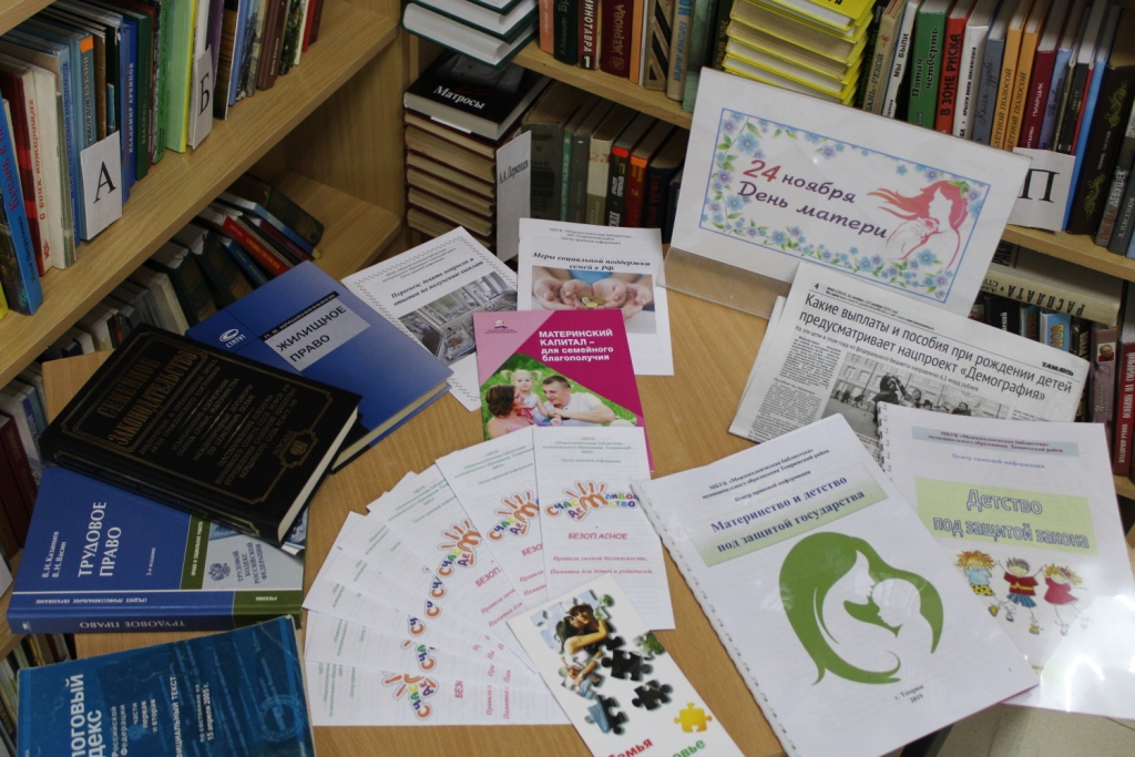 В связи с празднованием Дня матери и в целях поддержания традиции бережного отношения к женщине, повышения авторитета материнства Центром правовой информации межпоселенческой библиотеки оформлена тематическая выставка. Из материалов, представленных на выставке, можно узнать о правах матерей в трудовом, жилищном и налоговом кодексах, о правах беременных и работающих женщин имеющих детей, о материнском капитале и т.д.