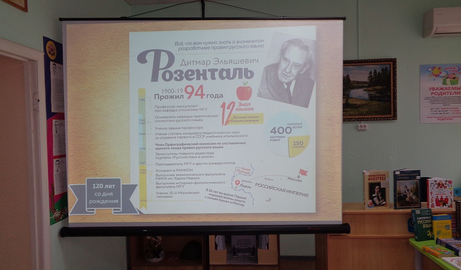 Также библиотекарь рассказала, что 24 февраля исполняется 120 лет со дня рождения знаменитого советского лингвиста, толкователя правил русского языка – Д. Э. Розенталя. Он внес огромный вклад в российское исследования лингвистики. На его учебниках выросло не одно образованное поколение.