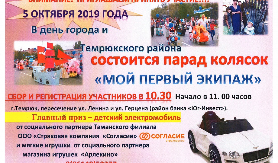 5 октября 2019 года в рамках празднования Дня города Темрюка состоится традиционный конкурс-парад колясок «Мой первый экипаж», его организатором является управление по вопросам семьи и детства администрации муниципального образования Темрюкский район.