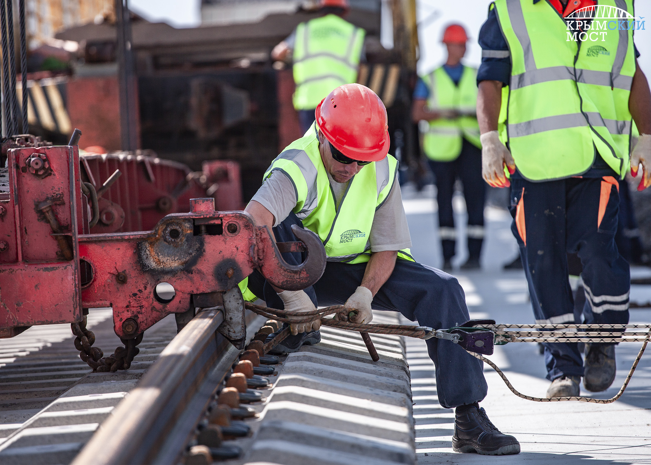 Параллельно выполняется строительство зданий для эксплуатации железнодорожной части моста. Суммарно на объекте в две смены работает почти 5 тысяч инженеров и рабочих.
