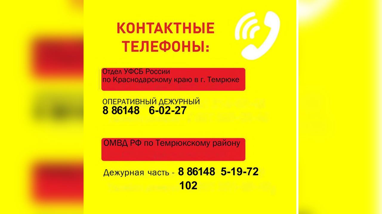 Оперативный дежурный Отдела УФСБ РФ по Краснодарскому краю в городе Темрюке: 8(86148)6-02-27