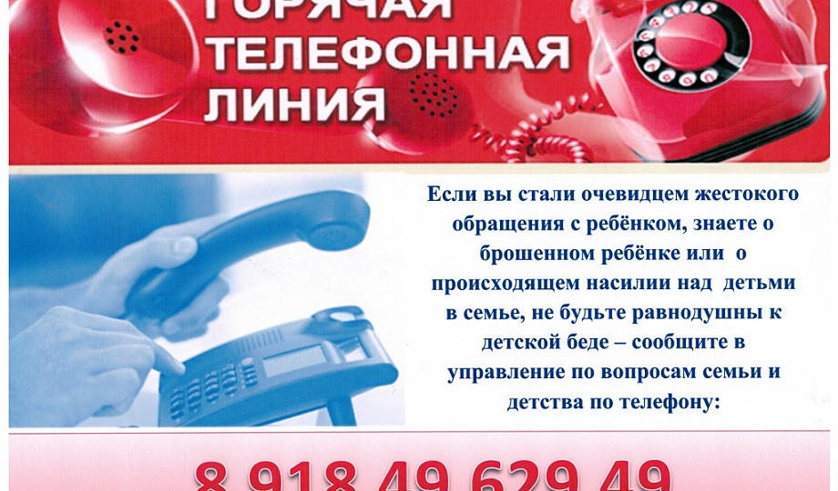 Если вы стали очевидцем жестокого обращения с ребёнком, знаете о брошенном ребёнке или о происходящем насилии над детьми в семье, не будьте равнодушны к детской беде - сообщите в управление по вопросам семьи и детства по телефону: 8(918) 49 629 49