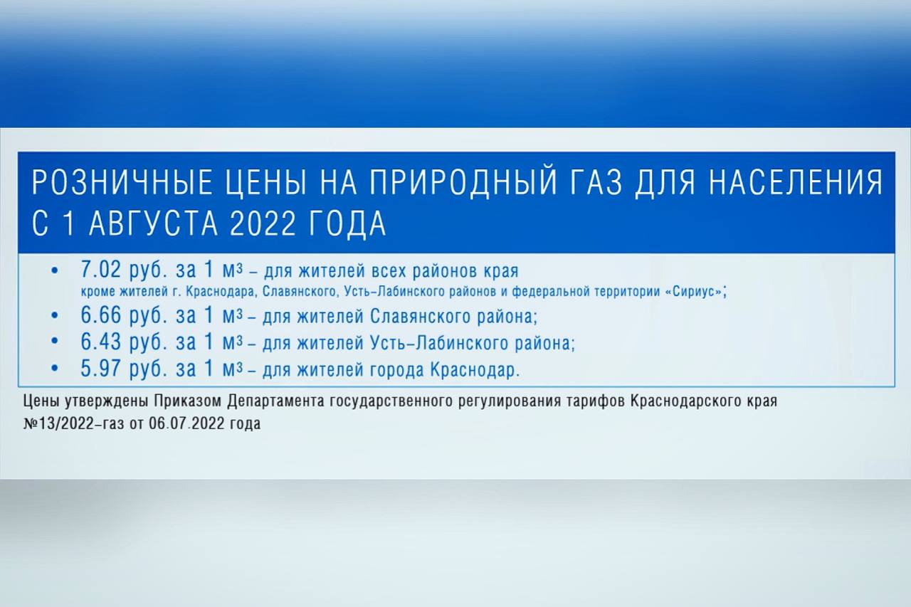 Приказом Департамента государственного регулирования тарифов Краснодарского края № 13/2022-газ от 06.07.2022 г. года для абонентов ООО «Газпром межрегионгаз Краснодар» с 1 августа 2022 года установлены следующие розничные цены на природный газ, реализуемый населению Краснодарского края: