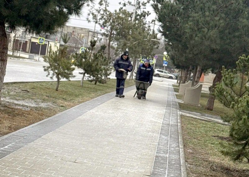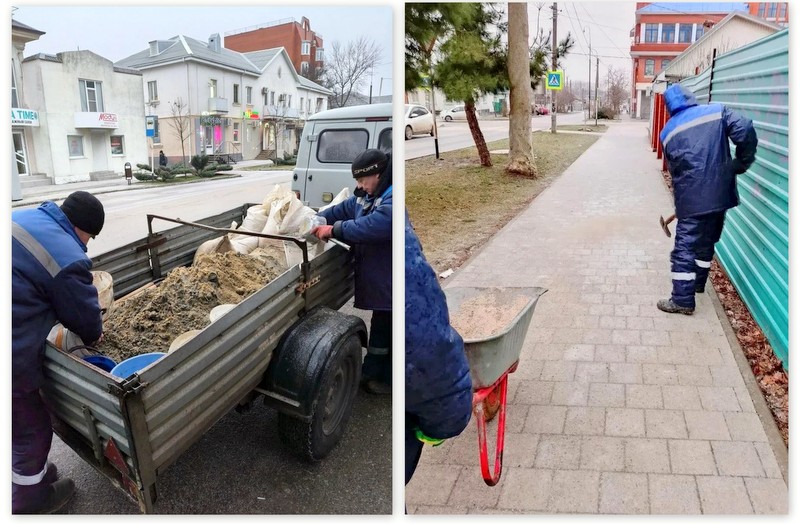 С раннего утра специалисты дорожных и коммунальных служб города Темрюка проводят обработку проезжих частей и тротуаров специальной смесью.