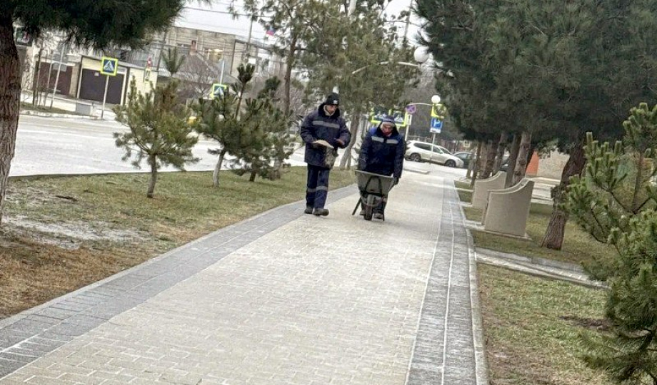 С раннего утра специалисты дорожных и коммунальных служб города Темрюка проводят обработку проезжих частей и тротуаров специальной смесью.