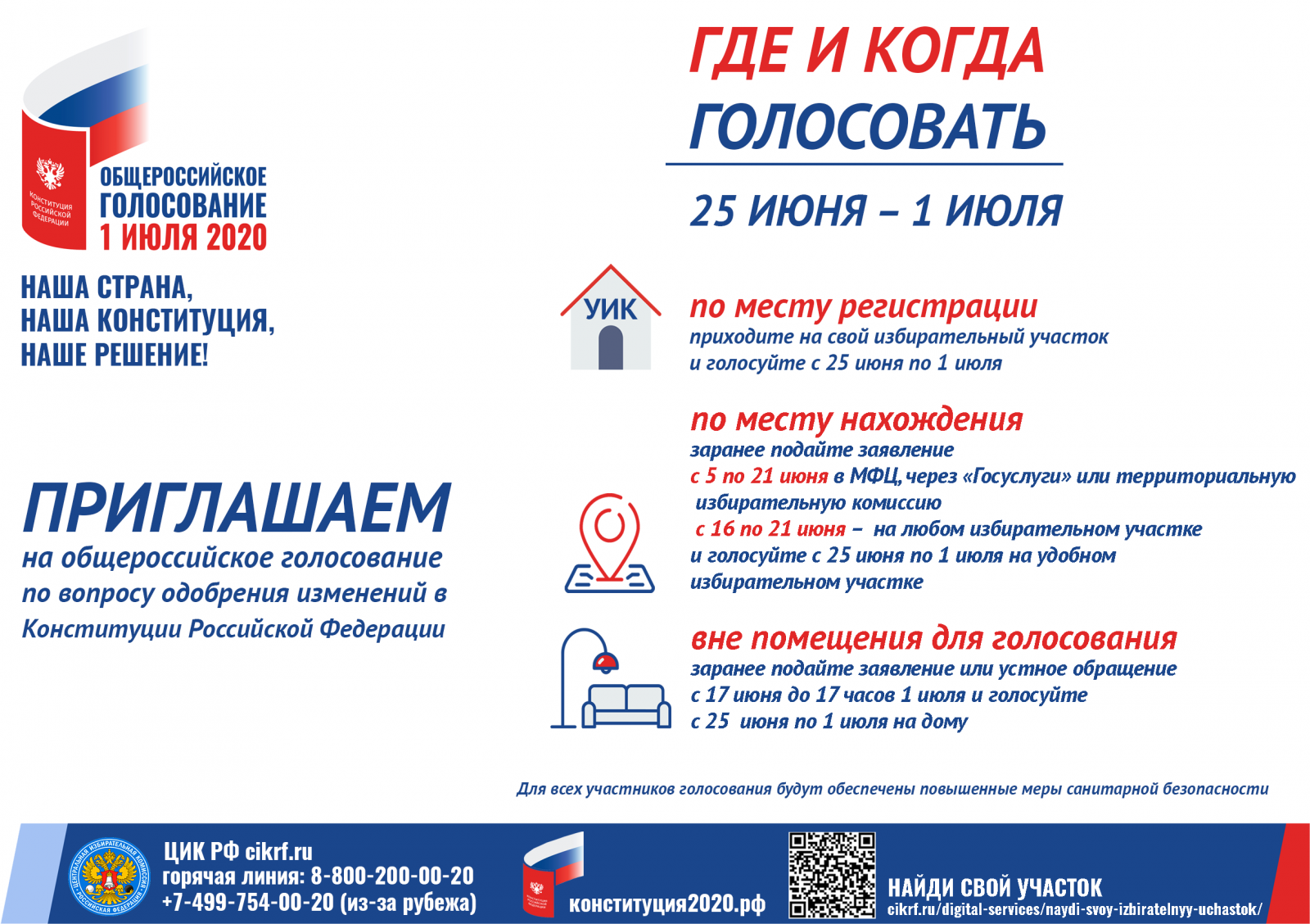 Общероссийское голосование по вопросу одобрения изменений в Конституцию Российской Федерации назначено на 1 июля 2020 года, время его проведения – с 8:00 до 20:00 по местному времени.