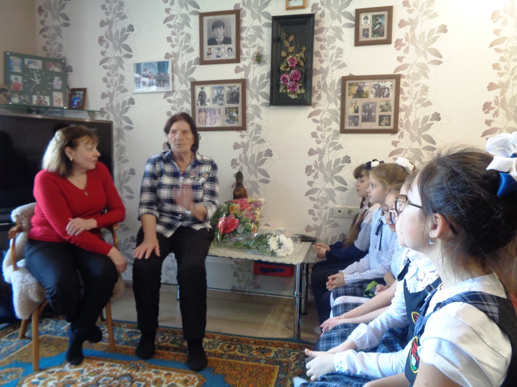 В уютной, доброй обстановке ребята послушали воспоминая женщин. Мария Кузьминична рассказала о том, что когда наступила война она жила в Омской области, была ученицей средних классов, до школы шла пешком 20 километров. В то время дети совмещали учебу и труд в поле: собирали колоски, делали снопы, всем, чем могли, помогали фронту.