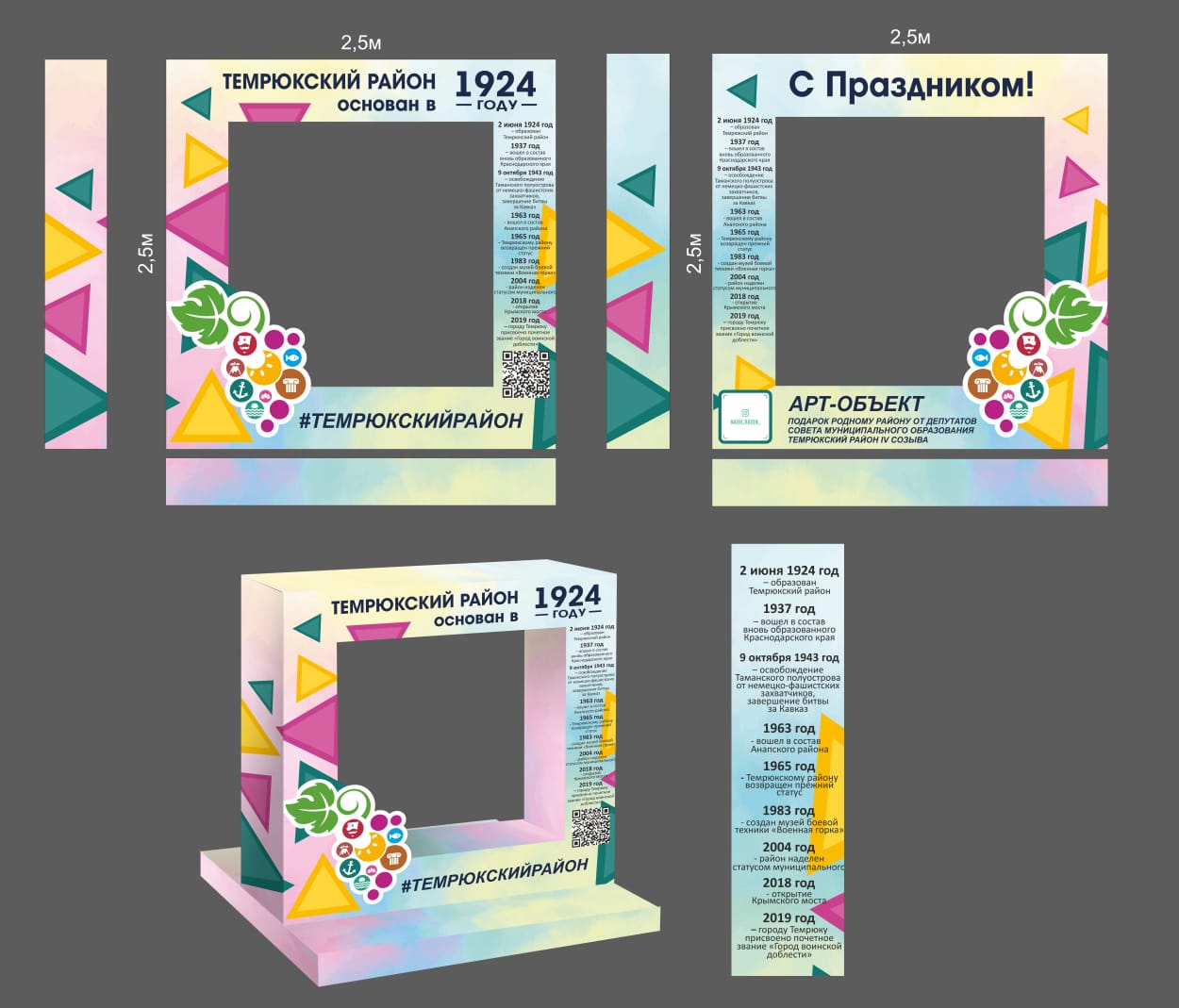 В день празднования 95-летия со дня образования Темрюкского района, 5 октября 2019 года, в Темрюке, в парке им. Пушкина и на площади Труда, с 12.00 начнут работу фотозоны «Открытка на память». Красочную и интересную площадку оформляет студия «Бери и дари». Еще один артобъект «95 лет Темрюкскому району» изготавливается при поддержке Совета муниципального образования Темрюкский район студией «Вега». Подарите себе открытку на память!