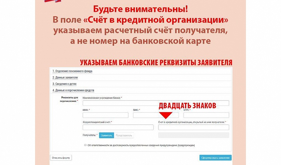 Семьи часто допускают ошибки при заполнении сведений и должны повторно подавать их, чтобы получить средства. Среди самых распространенных ошибок – когда в качестве заявителя указывается не владелец сертификата, а другой родитель или ребенок. Также часто встречаются опечатки при заполнении имени ребенка или даты его рождения, что не позволяет провести необходимую идентификацию. Некоторые заявители путают банковские реквизиты и вместо расчетного счета указывают номер карты.