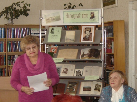 Людмила Мелешко и Ольга Лебедева рассказали этапы жизненного пути великого Кобзаря. На вечере звучали стихи Тараса Шевченко на украинском языке в исполнении Нины Максименко, песни, написанные на стихи поэта. Гости мероприятия смогли увидеть репродукции некоторых картин Тараса Шевченко. А в завершение встречи посмотрели художественный фильм «Тарас Шевченко» (1951г., режиссёр И. Савченко).