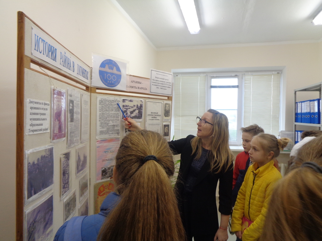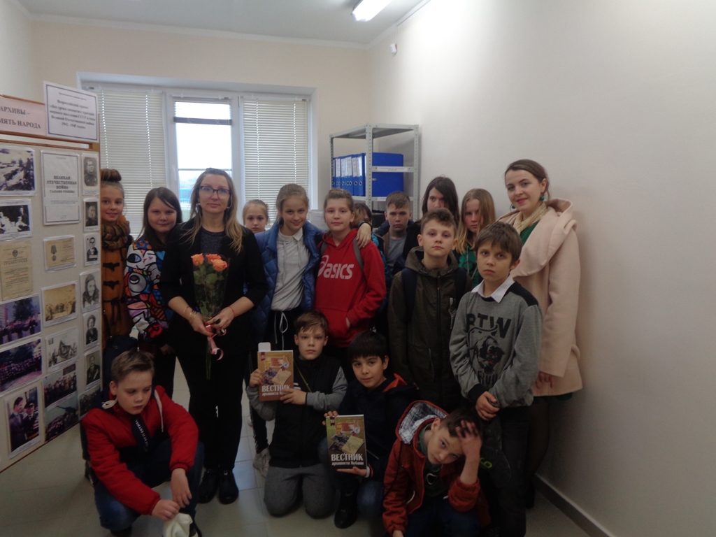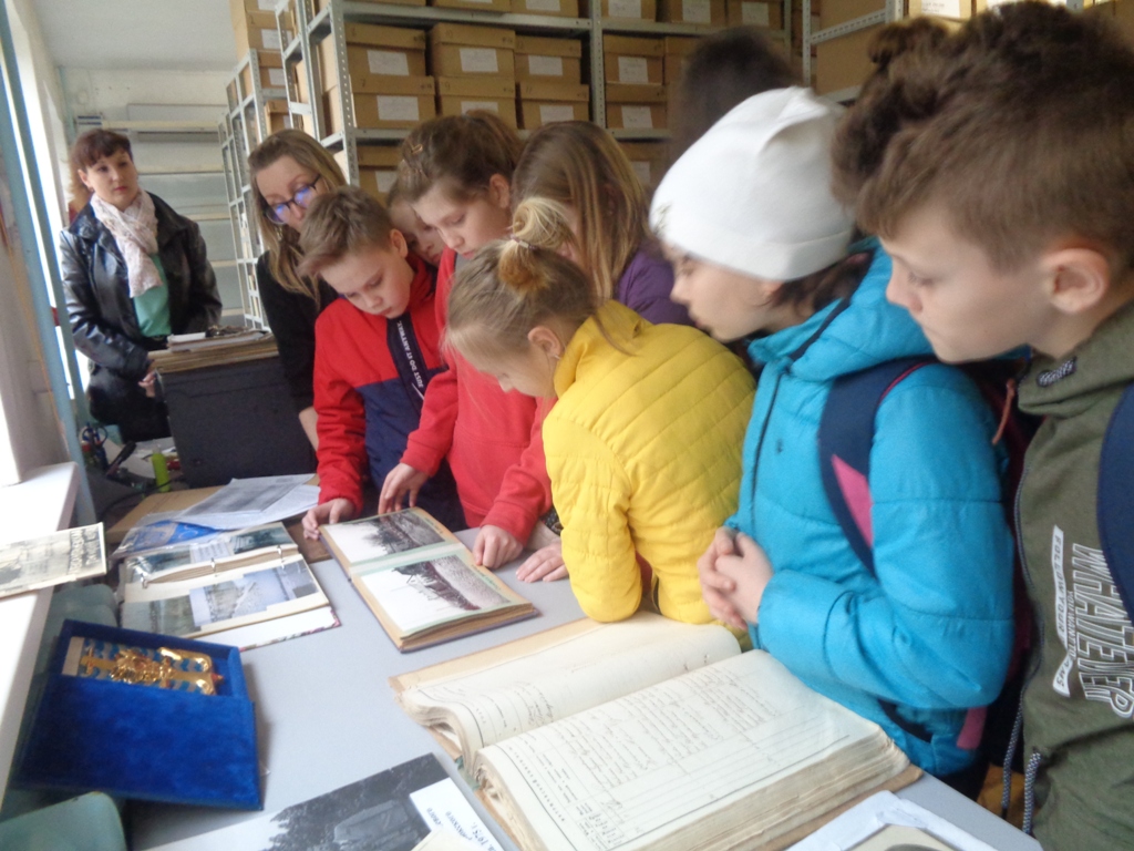 Школьников встретила начальник архива Елена Васильевна Падалица, которая провела для детей экскурсию по отделу. Ученики побывали в трех хранилищах, узнали сроки и условия хранения документов, познакомились с историческими документами, такими как: метрическими книгами, фотографиями военных лет, письмами с фронта и другими.