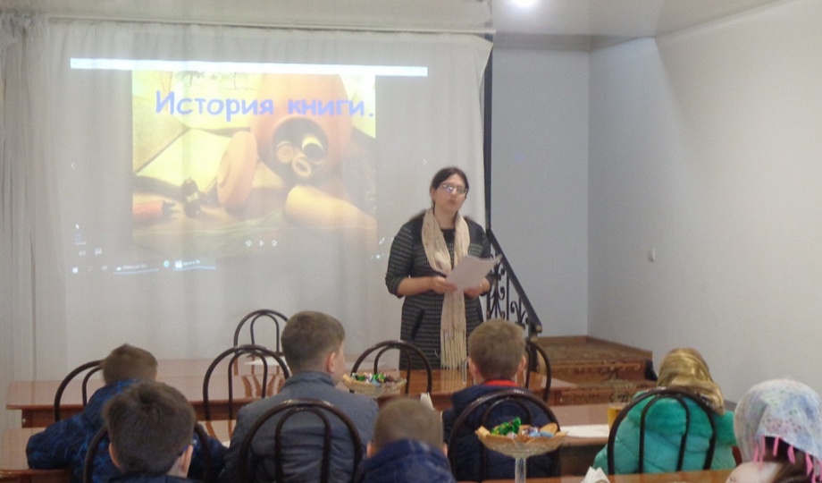 Далее дети отправились в административное здание храма, где им провела беседу-игру матушка Лариса. Ученики с помощью презентации узнали историю письменности, поиграли в игру «Угадай книгу?». В завершении встречи всем участникам похода подарили «Евангелие от Марка» и угостили сладкими подарками.