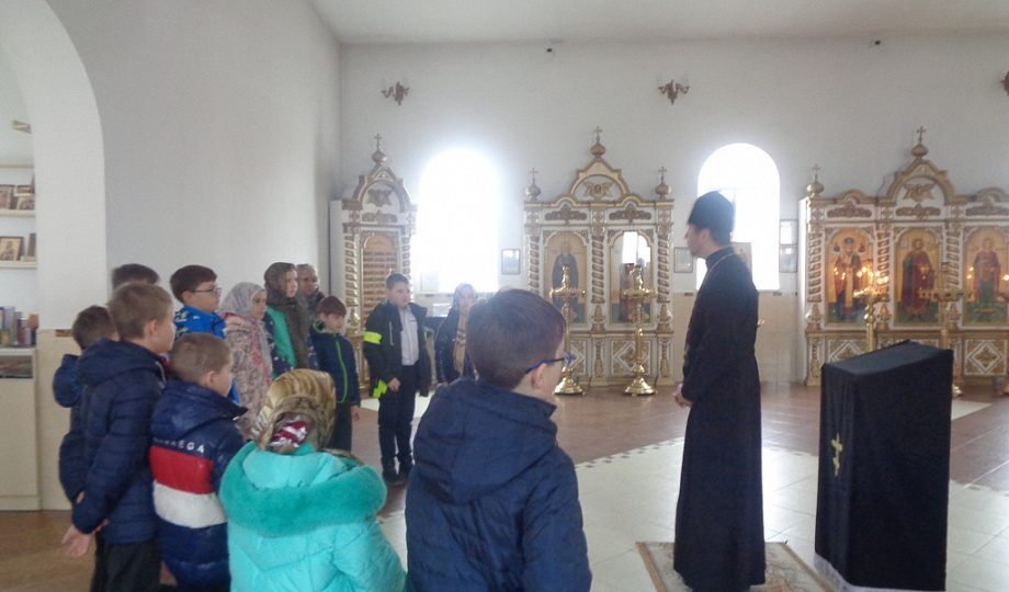 Школьников встретил настоятель храма протоиерей Виталий Колмык. Он провел экскурсию по храму,познакомил ребятс православными книгами.