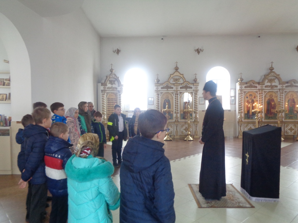 Школьников встретил настоятель храма протоиерей Виталий Колмык. Он провел экскурсию по храму,познакомил ребятс православными книгами.