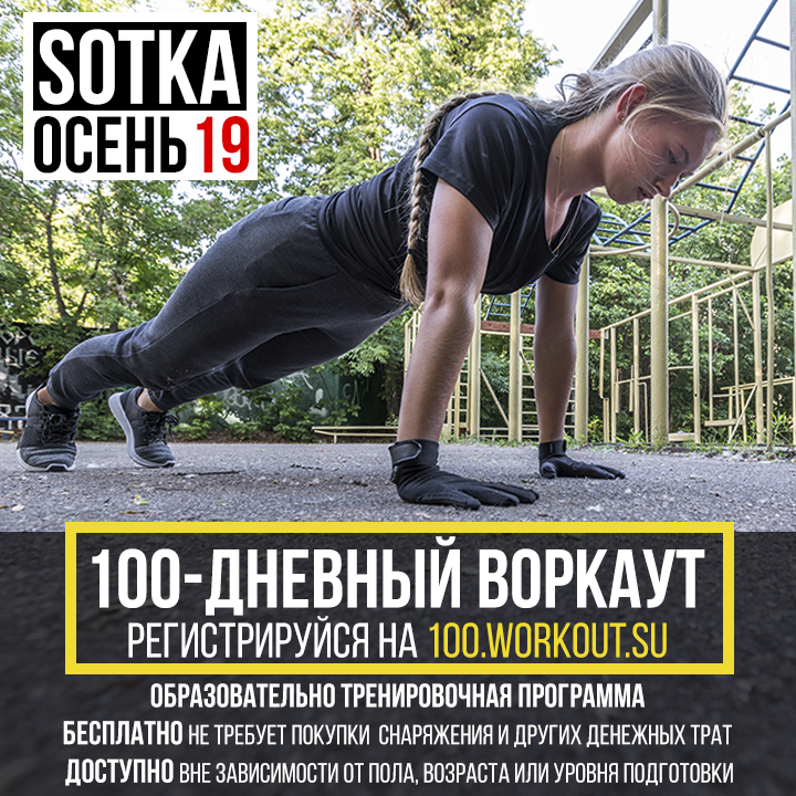 С 23 сентября 2019 года стартовал очередной бесплатной образовательно-тренировочной программы «SOTKA: 100-дневный воркаут» (Осень 2019). За последние несколько лет в этой программе приняли участие свыше 250 000 человек из 1274 городов в 61 стране мира.