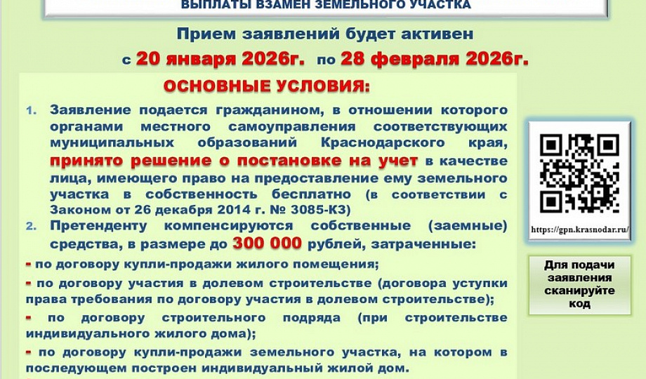 Согласно приказу министерства от 06 февраля 2026 года Nº 65 «О внесении изменения в приказ министерства топливно-энергетического комплекса и жилищно-коммунального хозяйства Краснодарского края от 15 января 2026 г. Nº 21 «О приеме заявлений об участии в мероприятии по получению компенсационной выплаты из бюджета Краснодарского края для компенсации собственных (заемных) средств, затраченных на приобретение (строительство) Жилого помещения» прием заявлений от граждан об участии в мероприятии продлен и будет проводиться по 28 февраля 2026 года включительно.