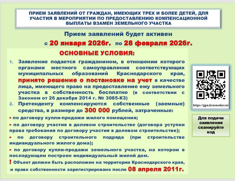 Согласно приказу министерства от 06 февраля 2026 года Nº 65 «О внесении изменения в приказ министерства топливно-энергетического комплекса и жилищно-коммунального хозяйства Краснодарского края от 15 января 2026 г. Nº 21 «О приеме заявлений об участии в мероприятии по получению компенсационной выплаты из бюджета Краснодарского края для компенсации собственных (заемных) средств, затраченных на приобретение (строительство) Жилого помещения» прием заявлений от граждан об участии в мероприятии продлен и будет проводиться по 28 февраля 2026 года включительно.