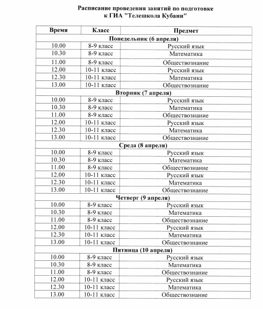 Расписание проведения занятий по подготовке к ГИА «Телешкола Кубани» (приложение).