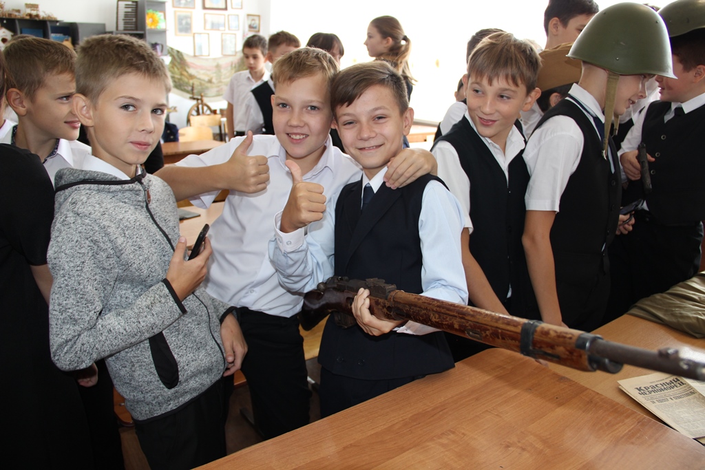 Наибольшим вниманием ребят пользовались записи в дневниках военных лет, сделанные одним из жителей города, защитные стальные шлемы РККА, муляж пистолета ТТ, а также шинель, сложенная в виде скатки.