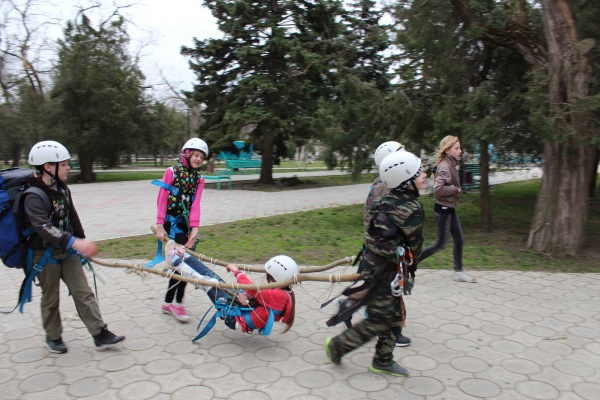 Дистанция включала в себя четыре блока. Это подъем по склону 900 и перестежка на параллельные перила на высоте 3,5 м, затем спуск на «восьмерке». У старшей возрастной группы второй блок включал оказание первой доврачебной помощи, вязание носилок для переноски пострадавшего. Один из участников показывал медицинскую аптечку и рассказывал о применении лекарственных средств. С этого этапа команды должны были перенести пострадавшего до пункта «навесная переправа». А затем быстро собрать и установить палатку.