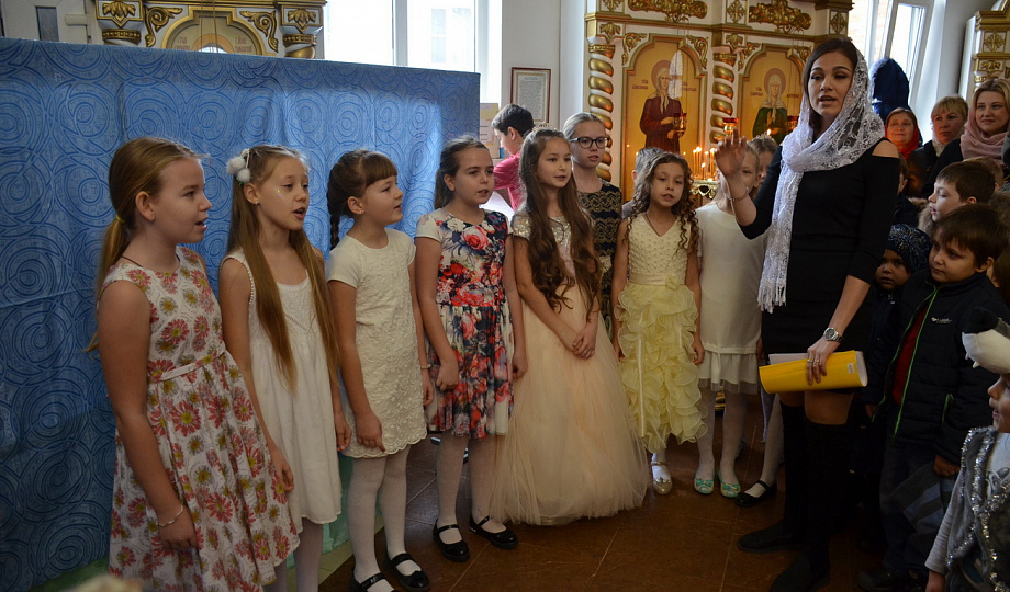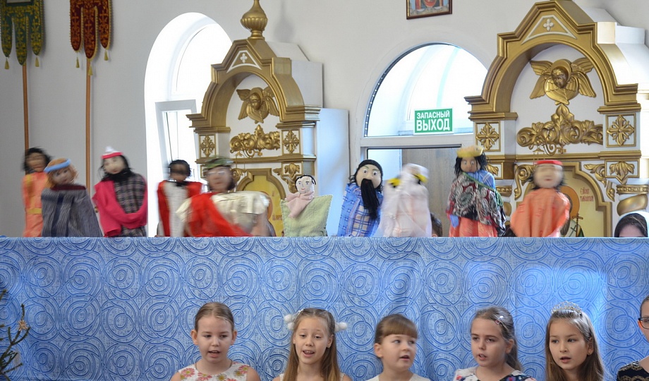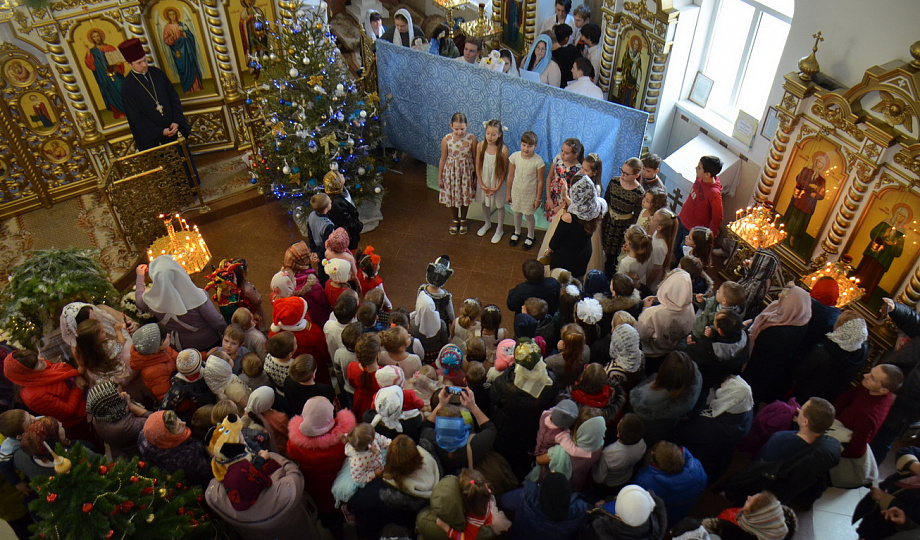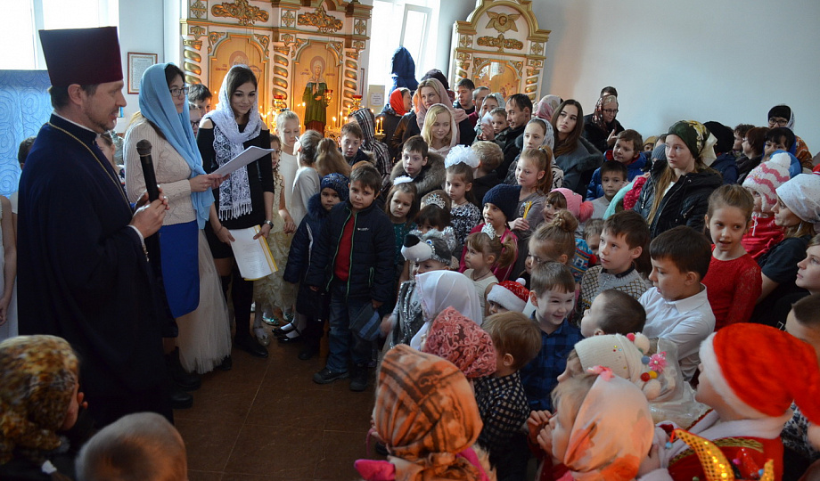 Воспитанники приходской воскресной школы для гостей подготовили кукольный театр, где была показана сценка «Подарок Царю». После выступления учащихся, на праздник пришли Дед Мороз и Снегурочка, которые провели с ребятами игровую программу. В заключение мероприятия более 100 детишек получили сладкие подарки.