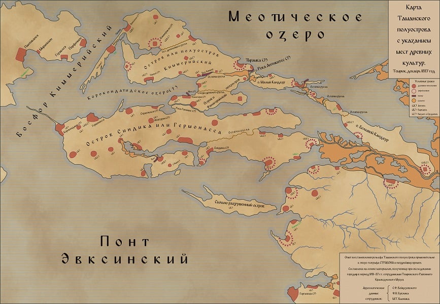 В частности, береговой контур карты выстроен в соответствие с комментариями античного географа Страбона и соответствует I веку Н.Э. То есть тому отрезку времени, когда Таманский полуостров представлял из себя архипелаг из 5-6 островов и на нем, по разным оценкам, располагалось от 27 до 53 древних поселений.