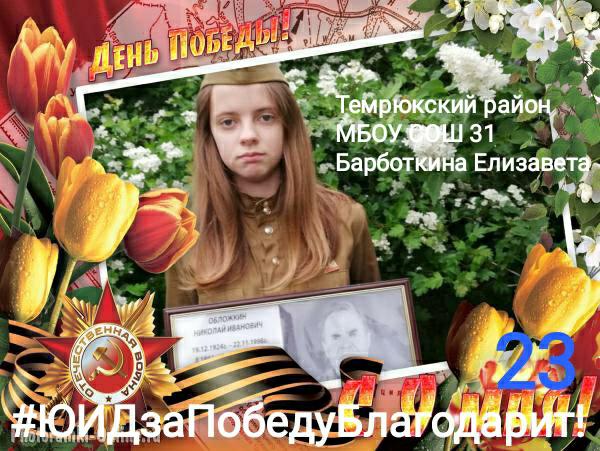Активисты ЮИДовского движения Темрюкского района поддержали интернет-марафон «Спасибо от ЮИД за Великую Победу!». Школьники делятся в социальных сетях фотографиями с портретами родственников – участников Великой Отечественной войны, рисуют тематические плакаты, читают стихи и поют песни в честь 75-й годовщины Великой Победы. Тем самым ЮИДовцы выражают благодарность всем героям войны за подвиг, который они совершили ради счастливой жизни своих потомков. Все фотографии и публикации дети сопровождают тематическими хэштегами #ЮИДПобеда75 #ЮИДзаПобедуБлагодарит.