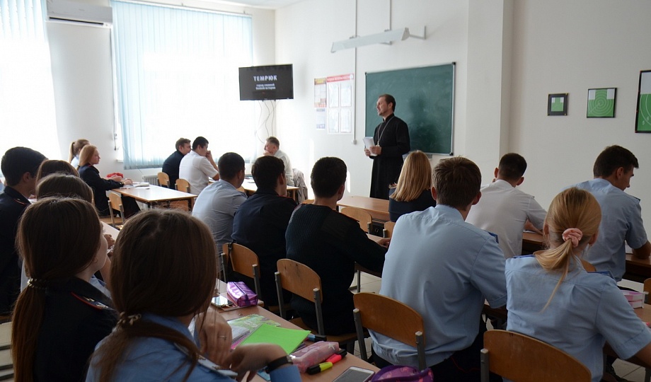 Протоиерей Виталий рассказал студентам, общая численность которых составила 62 человека, об ожесточенных боях в ходе Новороссийско-Таманской операции по разгрому немецко-фашистских войск, проходившей в 1943 году, в результате которой разгромленные части противника были прижаты к берегам Керченского пролива и уничтожены; о том, что разгромом таманской группировки врага и освобождением Таманского полуострова закончилась одна из самых героических битв Великой Отечественной войны — битва за Кавказ. Советские войска ликвидировали важный оперативный плацдарм противника, который обеспечивал ему оборону Крыма и возможность наступательных действий в сторону Кавказа. Германия была вынуждена вывести из Азовского Фморя все свои корабли. Освобождение Новороссийска и Таманского полуострова значительно улучшило базирование Черноморского флота и обеспечило в дальнейшем удары по крымской группировке противника с моря и через Керченский пролив.