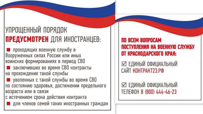 По всем вопросам поступления на военную службу от Краснодарского края - ЕДИНЫЙ ОФИЦИАЛЬНЫЙ телефон: 8(800)444-46-23. Все льготы и меры поддержки: контракт23.рф (https://xn--23-6kc3bbqgrrd.xn--p1ai/)
