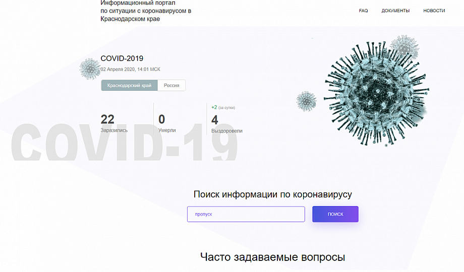 На сайт добавлены ответы на часто задаваемые вопросы. Самые распространенные из них связаны со сроками карантинных мер, ограничениями передвижения личного транспорта, финансами и кредитами, образованием, трудовыми отношениями и мерами государственной поддержки жителей Кубани. Список актуальных вопросов будет регулярно обновляться в зависимости от изменения ситуации. Сайт помогают наполнять волонтеры с горячей линии.