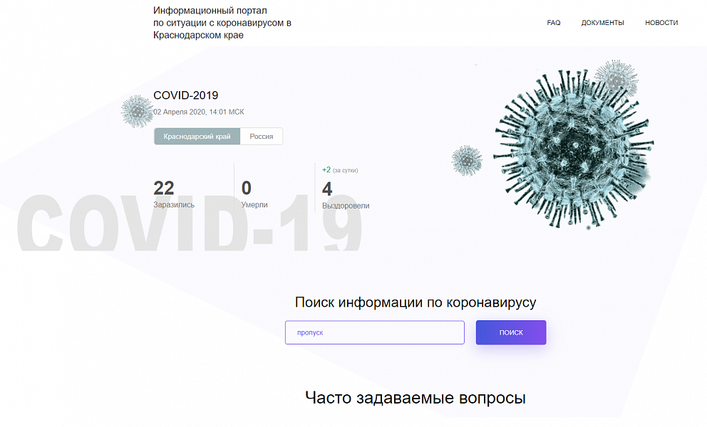 На сайт добавлены ответы на часто задаваемые вопросы. Самые распространенные из них связаны со сроками карантинных мер, ограничениями передвижения личного транспорта, финансами и кредитами, образованием, трудовыми отношениями и мерами государственной поддержки жителей Кубани. Список актуальных вопросов будет регулярно обновляться в зависимости от изменения ситуации. Сайт помогают наполнять волонтеры с горячей линии.