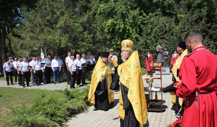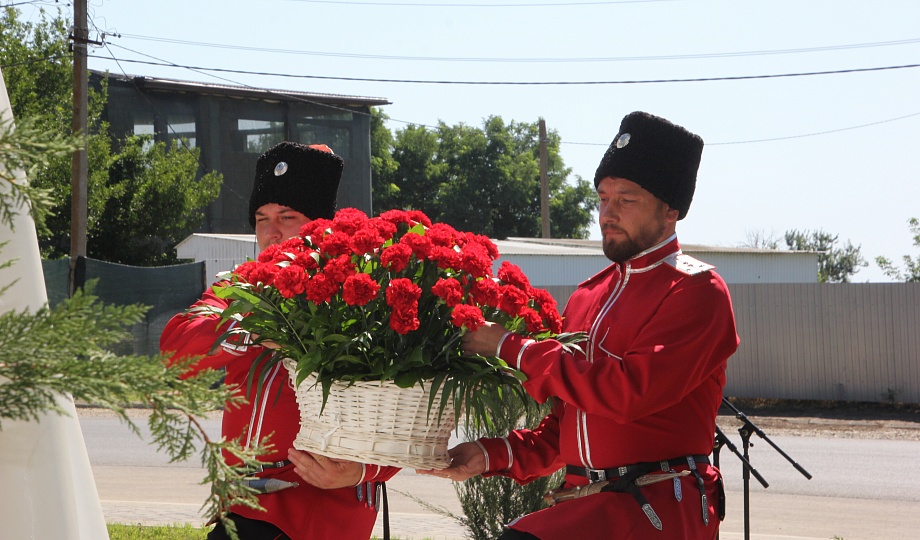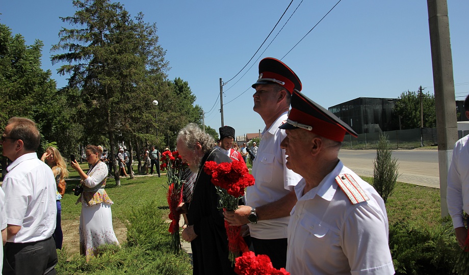 Памятник казакам освятил благочинный Темрюкского района протоирей Виктор Колмык. К монументу возложили цветы и венки.
