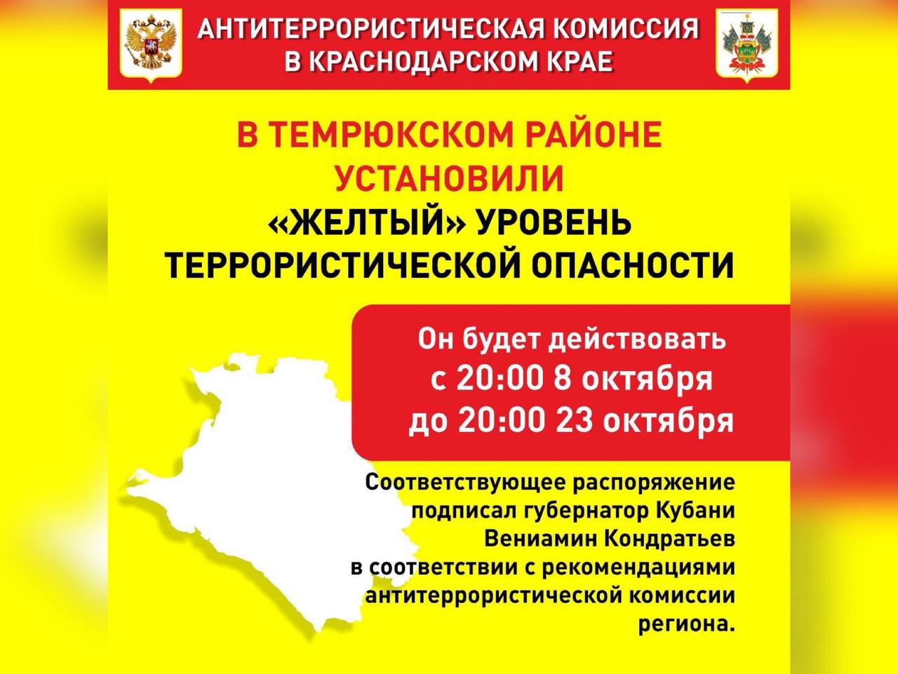 В Темрюкском районе Краснодарского края до 20:00 23 октября установили «желтый» уровень террористической опасности. Соответствующее распоряжение подписал Вениамин Кондратьев.
