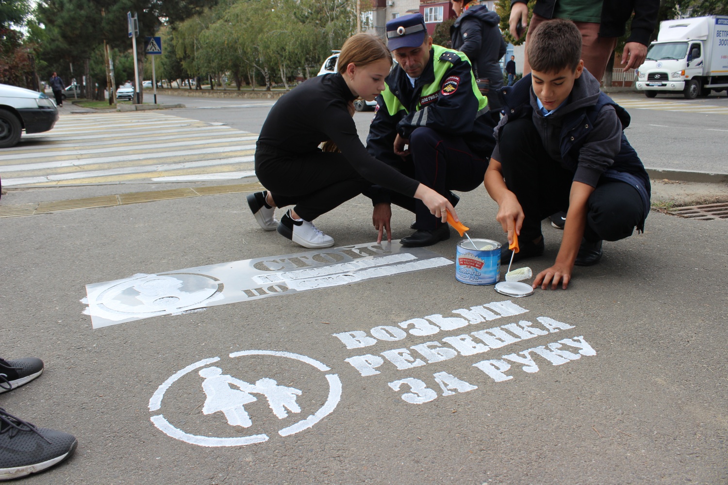 В рамках социальной кампании «Однозначно» госавтоинспекторы Темрюкского района Станислав Кузнецов и Александр Войтех вместе с учениками первой, третьей и тринадцатой школ нанесли профилактические надписи с помощью трафаретов.